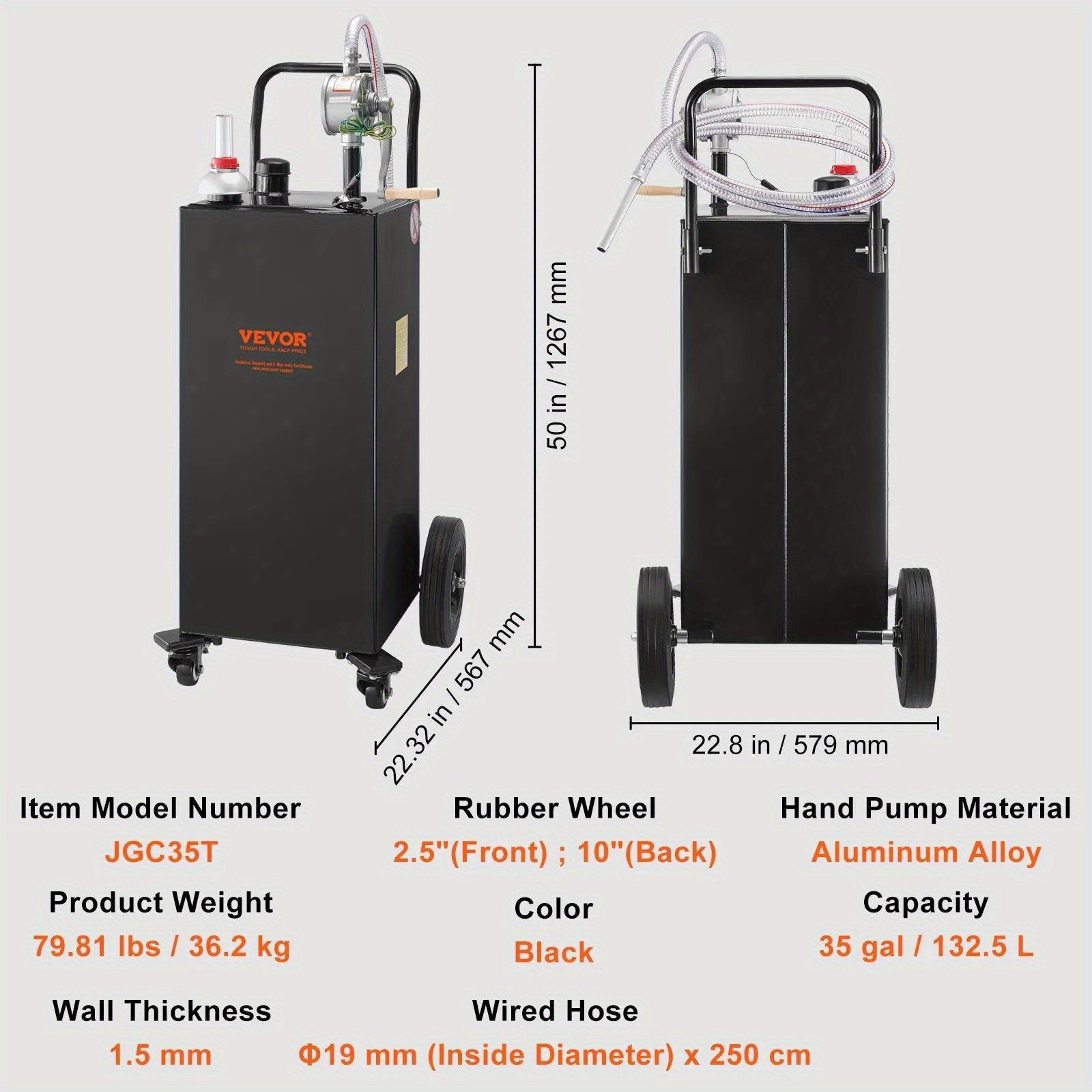 High Capacity: Holds up to 35 gallons (132 liters) of fuel, accommodating gasoline, diesel, or kerosene.