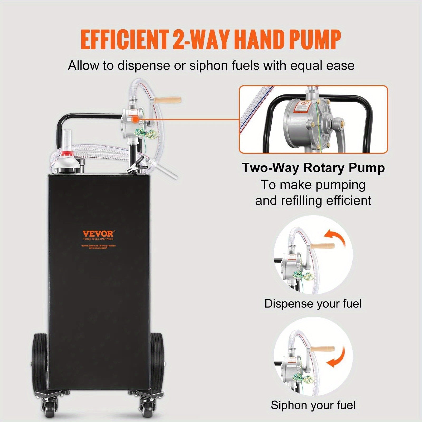 Two-Way Rotary Pump: Features a manual hand pump that allows both dispensing and siphoning of fuel by reversing the cranking direction.